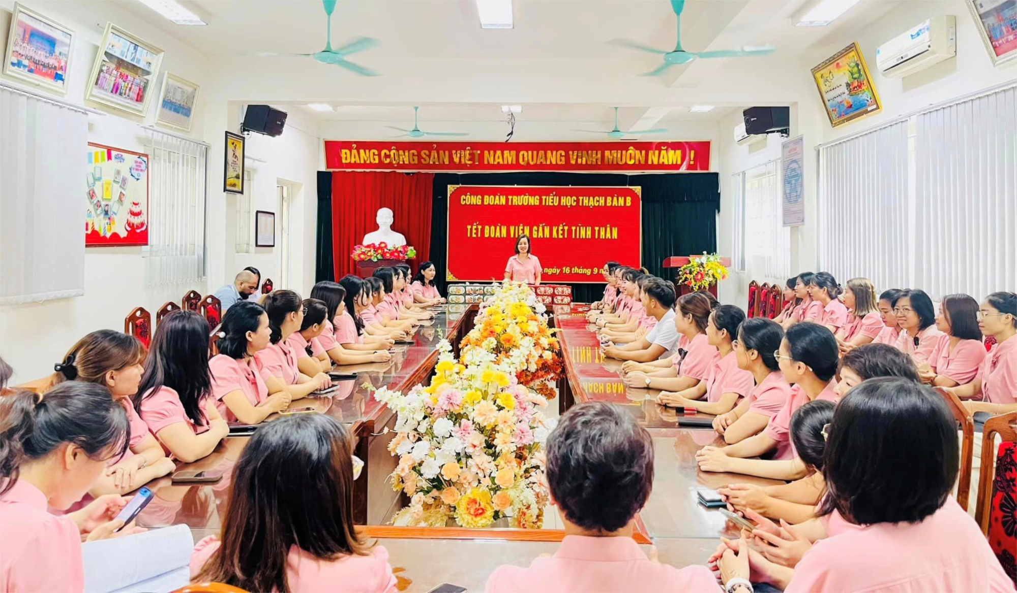 Ngày 16/9/2024, Công đoàn trường TH Thạch Bàn B đã tổ chức buổi gặp mặt nhận dịp Tết Trung thu 2024. Tại buổi gặp mặt, đồng chí Trần Thị Bích Diệp- Chủ tịch Công đoàn nhà trường đã gửi lời chúc Tết Trung thu đến toàn thể Công đoàn viên, đồng thời trao tặng đến tất cả Công đoàn viên một phần quà nhân dịp Tết Trung thu thay cho lời cảm ơn chân thành vì sự cống hiến và nỗ lực không ngừng nghỉ trong suốt thời gian qua.